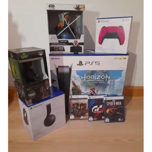 Paquete Sony PlayStation 5 con 2 controles (PS5), 4 juegos, auriculares y 2 soportes para controles
