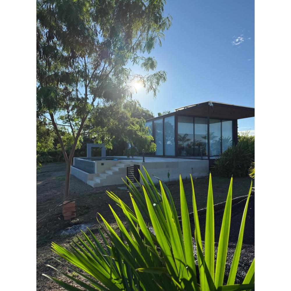 ventanales en vidrio templado de piso a techo, muchos frutales exóticos, algunos en produccion, sistema de riego wifi