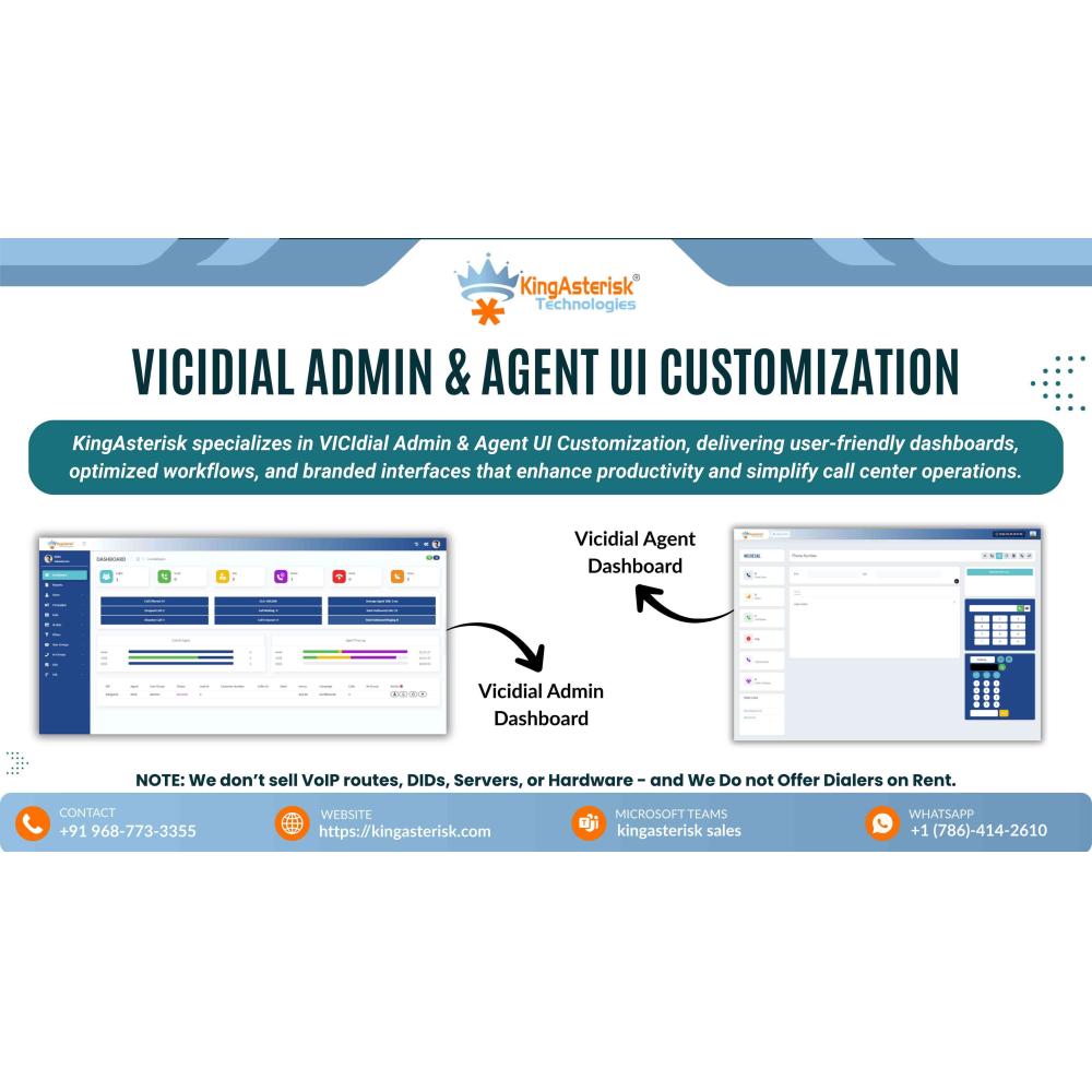 Still using that clunky, 90s-style VICIdial layout? We get it—the system is a powerhouse, but the default screen is a mess. It’s time to give your agents an interface that actually makes sense and doesn't give them a headache by noon. Discover Live – Watch Our Demo! : https://demo.kingasterisk.com KingAsterisk Technology fixes that by tailoring VICIdial’s admin and agent screens to fit your specific needs, making the whole system more effective. Optimized Agent Workflow Visual Admin Dashboards Responsive Design Brand Integration Note: We don’t sell VoIP routes, DIDs, servers, or hardware — and we do not offer dialers on rent. Call us: +91 968 773 3355 WhatsApp: +1 (786) 414 2610 Email: [email protected] Microsoft Teams: kingasterisk sales Visit our website https://kingasterisk.com or https://dialerking.com