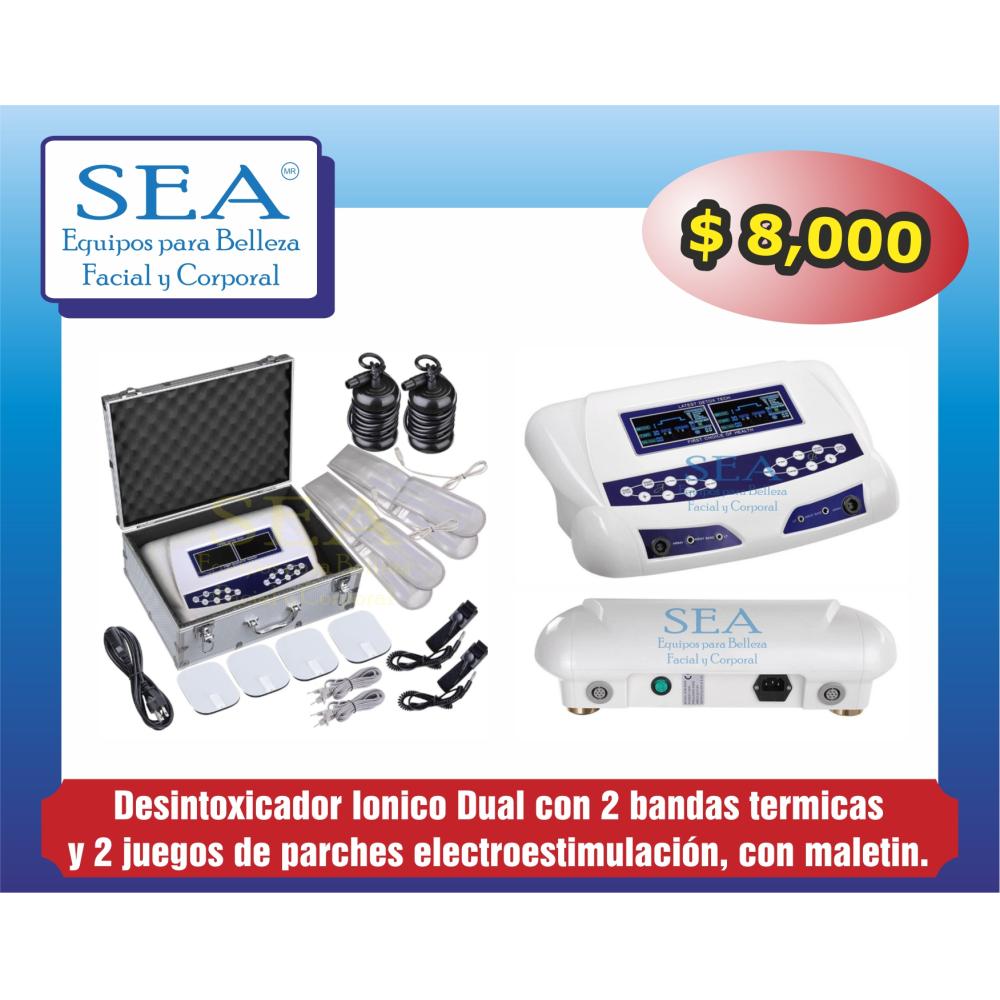 Modelo Doble para dos personas al mismo tiempo. Mas nuevo y efectivo, modelo original. Equipo tres en 1, es detox, banda termica y tens. Doble pantalla, 2 pulseras, 2 bandas, 2 array. 8 modos de ionizacion diferentes. Aparato profesional -Ideal para Spa- Unico con Garantia de 1 anio, equipos de uso rudo. ademas nuestro modelo esta controlado por microprocesador, Nuestros aparatos incluyen Banda de calor infrarroja. Relajacion, anti estres, salud. No requiere sal, este equipo SI FUNCIONA, los que utilizan sal solo oxidan el agua. Entrega inmediata, envio a todo Mexico por DHL. Contamos con todo tipo de equipos para spa y aparatologia. Entrega inmediata, Contamos con Garantía y soporte tecnico y respaldo directo de fabrica. somos importadores con mas de 18 años en el mercado, Le damos soporte a su inversión. Contactenos para ampliarle detalles e informacion o haga cita para que vea los productos sin compromiso. Envios a todo el pais por FedEx o DHL. https://seaequiposdebellezagdl.company.site