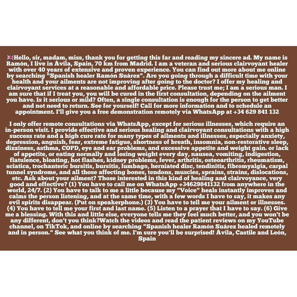 Hola,sr,sra,srta, gracias por llegar hasta aquí, y leer mi sincero anuncio, me llamo Ramón, vivo en Ávila España,a 70 km de Madrid,Soy un Veterano y Serio Sanador clarividente con más de 40 años de amplia y probada Experiencia,Infórmese de mi en internet buscando sanador español Ramón Suárez)¿Si está pasando por un mal momento de salud¿y no mejoran sus dolencias despué de ir al médico?Le ofrezco mis servicios de Sanación y clarividencia a un módico y asequible precio, confíe en mí por favor soy un hombre serio,Seguro que si yo le trato, se va a Curar en la primera consulta Dependiendo de la dolencia que tenga¿Si es Grave?o Leve? muchas veces con una sola consulta suele ser suficiente para que la persona se ponga bien y no tenga que volver, compruébelo llame para más información y cita previa y le hago a la distancia por whatsapp 00+34629841132 una demostración Gratis,haga Clic por favor en los enlaces o copiélos para ver los vídeos y leer los comentarios de los pacientes de cáncer y de otras patologías graves y crónicas¿a ver qué opinan de mi,Los pacientes¿se van a sorprender? https://youtu.be/Z62KCnv7ntI https://www.tiktok.com/@sanadorgallego?_t=ZN-8wnHYPGWHCA&_r=1 https://youtu.be/vPTGAN69Xn8 https://youtu.be/3oDJhp-9DDQ https://youtu.be/3zVsinF3I4k https://youtu.be/528FKJzoS8I Realizó solo a la Distancia por WhatsApp Excepto para Enfermedades graves que tendría que ser presencial..Efectivas y Serias Consultas de Sanación y Videncia con un alto grado de aciertos,y con una alta tasa de Curación de muchas clases de dolencias y enfermedades diversas Especialmente, de ansiedad depresión, angustia, miedo sentir mucho cansancio, sensación de ahogo, no dormir, sueño no reparador, mareos, asma, ahogo, Epoc, ojos, oído, mucho apetito engordar, o no tener apetito, o comer normal ,y perder peso cada día, náuseas, vomitos, malas digestiones, flatulencia, hinchazón, sofocos, riñón, fiebre, artritis, artrosis, reuma, ciática, trocanteritis, bursitis, lumbago, hernia discal, tendinitis, fibromialgia, túnel carpiano, y todas las de los huesos, tendones, músculos, esguinces, torceduras, luxaciones etc pregunte su dolencia ?.. Los que estén interesados¿ en esta clase de curación y clarividencia muy buena y efectiva? (1) tienen que llamarme por whatsapp 00+34629841132 desde cualquier parte del mundo 24H (2) tiene que hablar un poco conmigo porque mi "Voz"Cura mejora y tranquiliza a la persona que me escucha al momento y al mismo tiempo con unas palabras que yo tengo que decir hace desaparecer a los malos espíritus si los tuviera¿ poniendo el altavoz del teléfono (3)tiene que decirme la dolencia o las enfermedades que tenga(4)tiene decirme el nombre y los apellidos (5)escuchar una oración que yo tengo que rezar(6)darle la bendición y con esto y poco mas, todos me dicen que se encuentran muy bien y usted no va a ser diferente no le parece¿mire los videos y lea los comentarios de los pacientes curados a la distancia y presencialmente?a ver qué opinan de mí¿seguro se van a sorprender? Ávila Castilla y León España