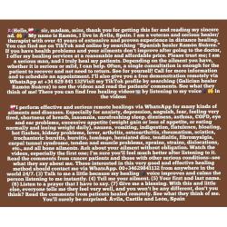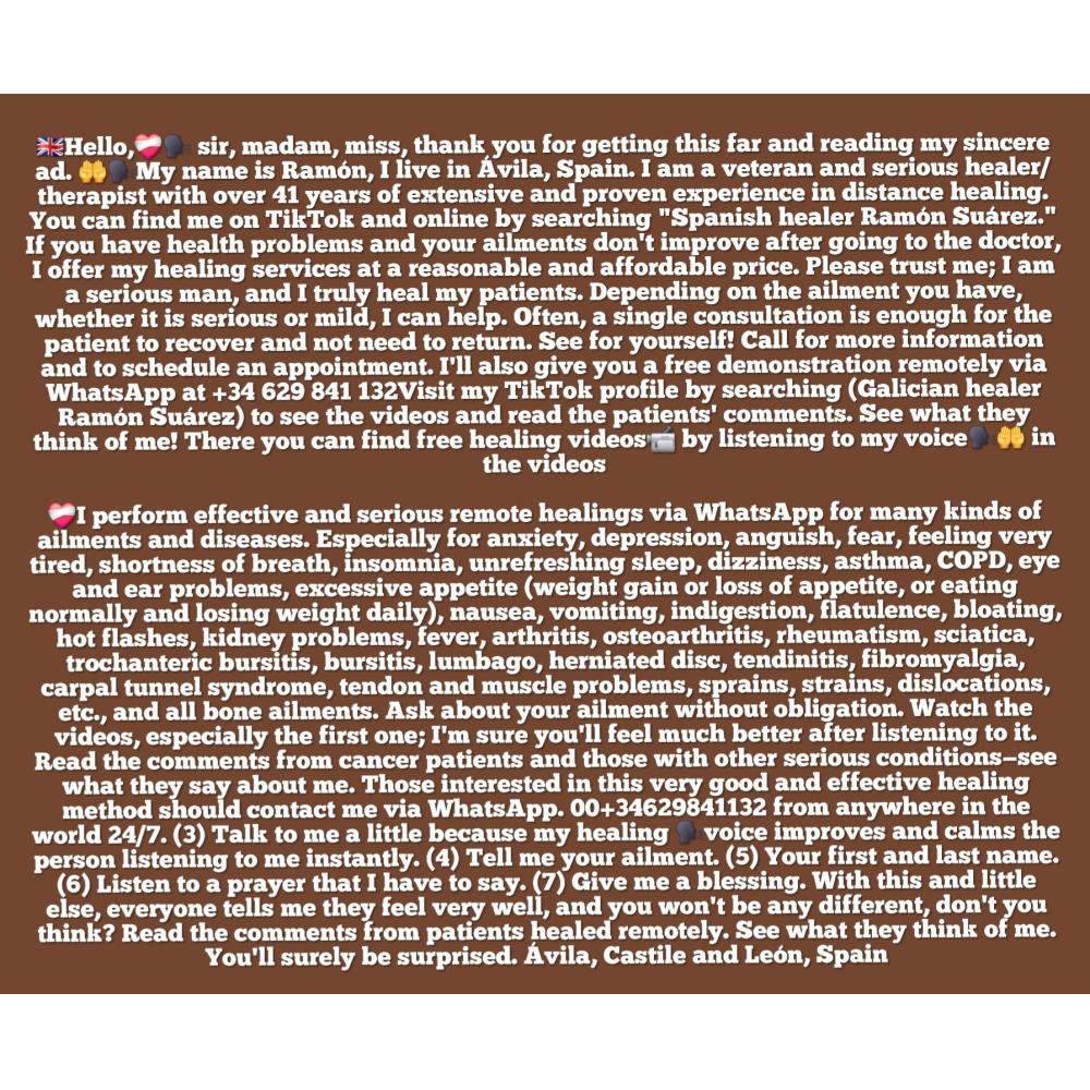 Hola,Sr,Sra,Srta, gracias por llegar hasta aqui, y leer mi sincero anuncio,me llamo Ramón, vivo en Ávila España,Soy un Veterano y Serio Sanador terapeuta con más de 41 años de amplia y probada Experiencia en sanaciones a la Distancia Infórmese de mi en Tik Tok y en internet buscando "sanador español Ramón suárez"?Si tiene problemas de salud¿ y no mejoran sus dolencias después de ir al médico?Le ofrezco mis servicios de Sanación a un módico y asequible precio, confie en mi por favor soy un hombre serio, y Sano de verdad a los pacientes¿ Dependiendo de la dolencia que tenga?Si es Grave?o Leve? muchas veces con una sola consulta suele ser suficiente para que el paciente se ponga bien y no tenga que volver, compruébelo llame para más información y cita previa, y le hago a la distancia por whatsapp 00+34629841132 una demostración Gratis,Haga clic por favor en los enlaces o cópielos para ver los vídeos y leer los comentarios de los pacientes?a ver qué opinan de mí¿ en este primer enlace hay una demostración de Sanación❤️‍🩹 al momento Gratis escuchando mi Voz🗣🎙️en el video📹 https://youtu.be/5DDnkl047qo?is=1NymEgDUDW9yhnbW https://youtu.be/Z62KCnv7ntI https://www.tiktok.com/@sanadorgallego?_r=1&_t=ZN-956dWstV2Jy https://youtu.be/vPTGAN69Xn8 https://youtu.be/3oDJhp-9DDQ https://youtu.be/3zVsinF3I4k https://youtu.be/528FKJzoS8I ❤️‍🩹Realizó a la Distancia🤲 por WhatsApp Efficaces y Serias Sanaciones de muchas clases de dolencias y enfermedades diversas. Especialmente, de ansiedad depresión, angustia, miedo sentir mucho cansancio, sensación de ahogo, no dormir, sueño, no reparador, mareos, asma, ahogo, Epoc, ojos, oido, mucho apetito engordar, o no tener apetito, o comer normal ,y perder peso cada día, náuseas, vomitos, malas digestiones, flatulencia, hinchazón, sofocos, riñón, fiebre, artritis, artrosis, reuma, ciática, trocanteritis, bursitis, lumbago, hernia discal, tendinitis, fibromialgia túnel carpiano tendones músculos esguinces torceduras luxaciones etc y todas las de los huesos, pregunte su dolencia sin compromiso mire los vídeos sobre todo el primero seguro que al escucharlo se va a encontrar muy bien🎙️en el video📹lea los comentarios de pacientes de cáncer y de otras patologías graves?a ver que comentan de mi?.>>>>¿Los que estén interesados?en esta clase de Sanación muy buena y efectiva(1) tienen que llamarme por whatsa 00+34629841132 desde cualquier parte del mundo 24H.(3) hablar un poco conmigo porque mi 🗣"Voz"Sana mejora, y tranquiliza a la persona que me escucha al momento.(4) decirme la dolencia que tenga (5)el nombre y los apellidos (6) escuchar una oración que yo tengo que rezar (7) darle la bendición y con esto y poco mas todos me dicen que Se encuentran muy bien y usted no va a ser diferente¿ no le parece?Lea los comentarios de los pacientes sanados a la distancia¿a ver qué opinan de mi?Seguro se va a sorprender, ÁvilaCastilla y León, España