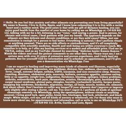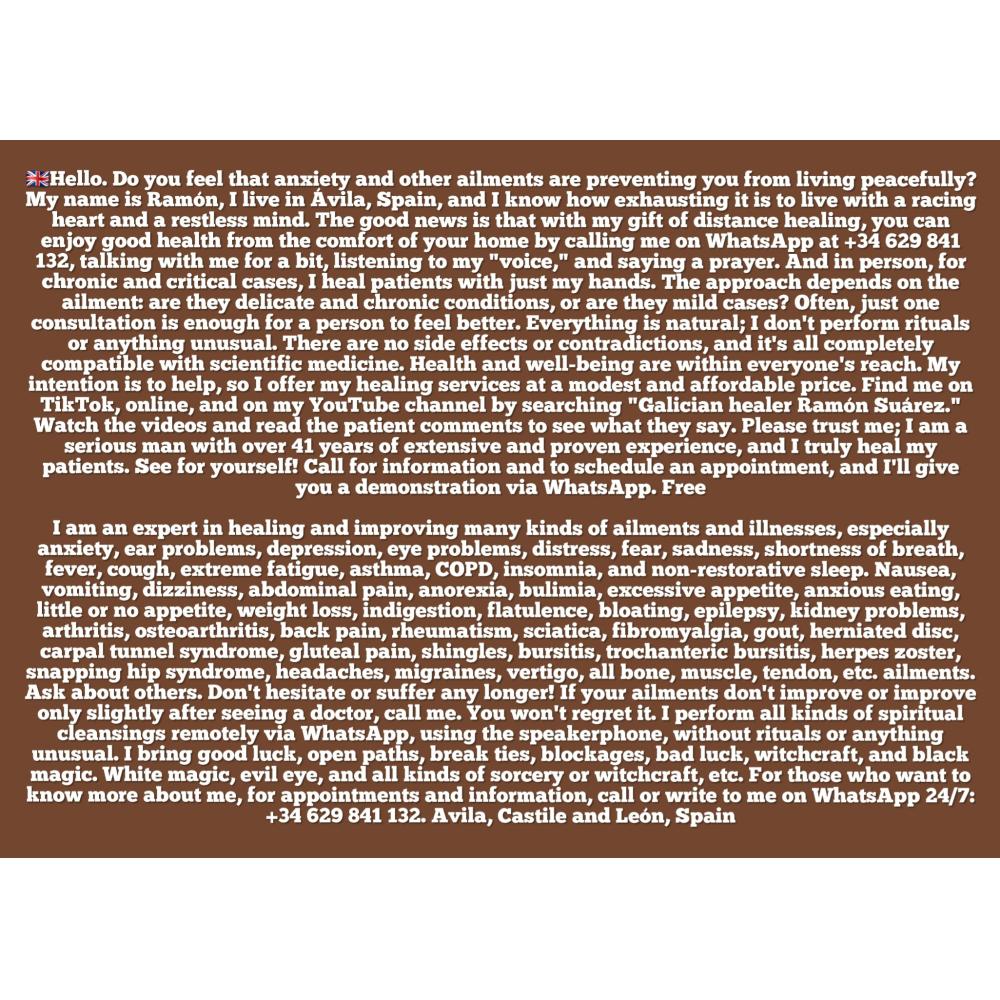 Hola,buenos días,tardes,o noches gracias por leer mi sincero anuncio que he creado para usted y para todos los que todavía no me conozcan?me llamo Ramón, vivo en Ávila, España, a 70 km de Madrid Infórmese de mi en tiktok, en YouTube,y en internet, buscando "sanador gallego Ramón Suárez"¿Soy un Veterano y Serio Sanador terapeuta con más de 41 años de amplia y probada Experiencia en curaciones a la Distancia.. para muchas clases de dolencias.. y enfermedades.. diversas,Leves especialmente, de ansiedad, depresión y muchas otras, pregunte?Si está pasando por un mal momento de salud físico,y psicológico? Y no mejoran sus dolencias,o mejoran poco después de ir al médico?Le ofrezco mis servicios de sanación a la distancia.. a un módico y asequible precio,confíe en mí por favor,Soy un sanador serio y Curo de verdad a los pacientes? Dependiendo de la dolencia que tengan?si son patologías crónicas y delicadas? o si son casos leves ¿ muchas veces con una sola consulta suele ser suficiente para que la persona se ponga bien¿?..Los que estén interesados en esta clase de Sanación a la distancia muy buena y Efectiva? (1) tienen que escribirme por whatsapp 00+34629841132,decirme el nombre y los apellidos,asi como el país o lugar desde donde me contactan..luego llamarme, y decirme la enfermedad o dolencias que tenga, hablar un poco conmigo, porque mi "Voz"Sana mejora, y tranquiliza a la persona que me escucha al momento en cualquier parte del mundo 24H/7.. (2)..escuchar una oración que yo tengo que rezar (3) darle la bendición y con esto y poco mas todos me dicen que Se encuentran muy bien y usted no va a ser diferente no le parece? Compruébelo llame para más información y cita previa y le hago a la distancia por whatsapp una demostración Gratis, mire los vídeos en estos enlaces y lea los comentarios de los pacientes a ver qué opinan de mí? seguro que se van a sorprender¿ https://youtu.be/VyuBXfnvf6Y?is=GT3RSQOjki-SlfXj https://www.tiktok.com/@sanadorgallego?_r=1&_t=ZN-956dWstV2Jy https://youtu.be/Z62KCnv7ntI https://youtu.be/vPTGAN69Xn8 https://youtu.be/3oDJhp-9DDQ https://youtu.be/3zVsinF3I4k https://youtu.be/528FKJzoS8I ?Dependiendo de la dolencia que tengan?Si son Leves? Puede ser a la Distancia¿y si son serias cronicas y avanzadas?Tiene que ser de forma presencial,para estos casos es mucho mejor es más rápido y eficaz, sobre todo para estas patologías complejas.. presencialmente,Sano y mejoro a los pacientes Sólo con mis Manos sin hacer rituales ni cosas Raras muchas veces con una sola consulta suele ser suficiente para que el paciente se ponga bien?depende de la dolencia que tenga? Si es leve? Con una vez llega? Y si son patologías más críticas y serias¿ tiene que ser más de una Vez, (3)Veces es lo mas normal una consulta cada día,y en este tiempo y ya desde el primer día tiene que ponerse bien bien garantizado Soy Experto en Sanar Con Una sola Consulta muchas clases de dolencias y enfermedades diversas especialmente, de ansiedad, depresión, angustia, miedo sentir mucho cansancio, sensación de ahogo, no dormir, sueño, no reparador, mareos, asma, ahogo, Epoc, ojos, oido, mucho apetito engordar, o no tener apetito, o comer normal ,y perder peso cada día, náuseas, vomitos, malas digestiones, flatulencia, hinchazón, sofocos, riñón, fiebre, artritis, artrosis, reuma, ciática, trocanteritis, bursitis, lumbago, hernia discal, tendinitis, fibromialgia túnel carpiano tendones músculos esguinces torceduras luxaciones etc pregunte su dolencia sin compromiso, mire los vídeos, y lea los comentarios de los pacientes ?a ver que piensan de mí¿..Si sospecha que pudiera estar siendo víctima de alguna clase de maleficio?...Realizó a la distancia por whatsapp poniendo el altavoz del tlfno sin hacer rituales ni cosas raras al momento, toda clase de limpiezas espirituales, doy suerte abro los caminos rompo ataduras, bloqueos mala suerte, hechicería, magia Negra. Magia blanca mal de ojo, etc? Pregunte otras¿para los que quieran saber más de mí para cita previa he información llamen al Whatspp 00+34629841132 Avila, España