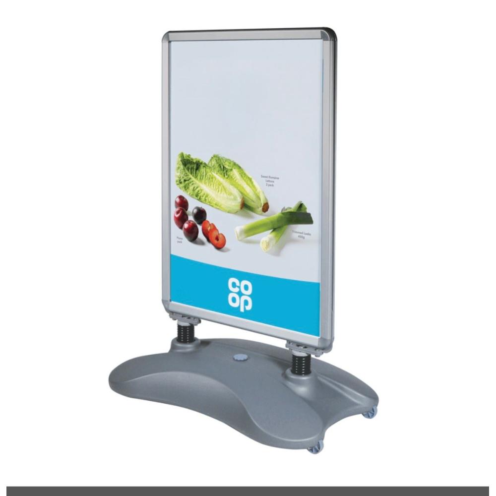 Silver aluminum A-frame stand with wheels, commonly used for sidewalk or grocery promotions. Sturdy, lightweight, easy to move, and designed for quick poster changes—perfect for in-store or outdoor visibility. Ideal for salons, spas, clinics, or retail spaces. 📩 Message for more details, photos, and pricing.